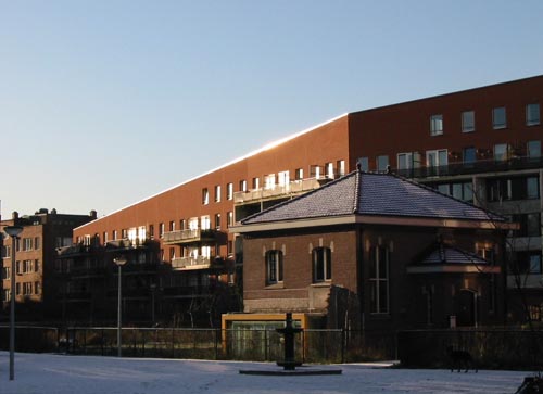 Another pic from these buildings close to my home, the GWL compound (Gemeentelijk WaterLeidingbedrijf / Waterworks). There are 600 appartments, all created enviroment friendly, which means, no cars, hardly any car-parking places, many gardens, you can even rent one here, lots of water places, rainwater is used for toilets… and so on. A nice place to hang out. (more at www.gwl-terrein.nl )