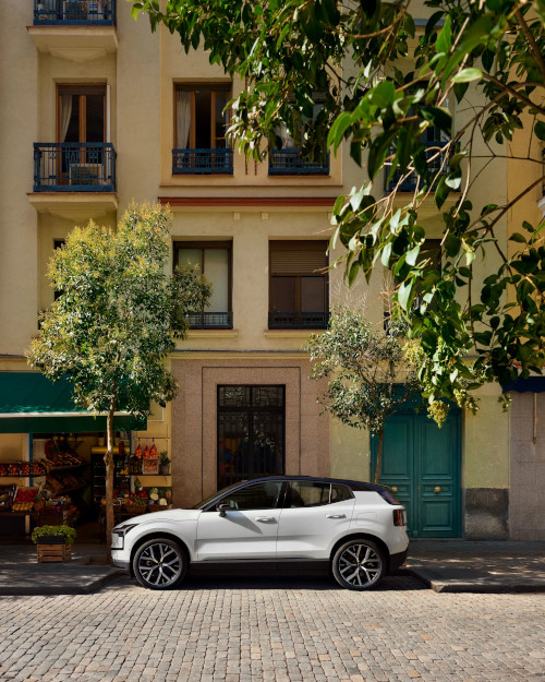 2026 – Volvo EX30 in a historic cobble stone street, looks like somewhere in Madrid, bet where?