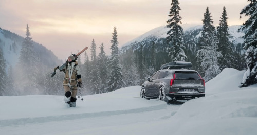 2026 – Volvo EX60 in the snow with skier, but where? Maybe Norway or Sweden?
